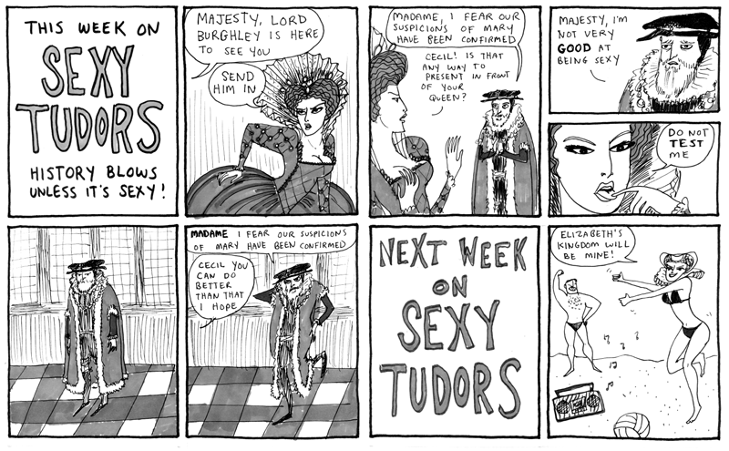 Divorced (Catherine of Aragon), Beheaded (Anne Boleyn) , Died (from complications of childbirth, Jane Seymour), Divorced (Marriage annulled, actually, but that doesn't make it as catchy, Anne of Cleves), Beheaded (Catherine Howard), Survived (Katherine Parr). Six women, one hugely powerful, and as he aged, increasingly erratic and unpredictable ruler, whose chief obsession during his reign was to beget sons. Despite my Masters degree in History, where I spent part of a year studying the various Tudors, especially Elizabeth, I do love me some Sexy Tudors. Sadly, they never got round to showing Mary or Elizabeth's reigns, but I'm confident that Kate Beaton has captured what it would have looked like: